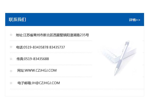 傳真:0519-83435688    郵編:213135    網址:WWW.czjhgj_com.jlhlxr.com    電子郵箱:JH@czjhgj_com.jlhlxr.com